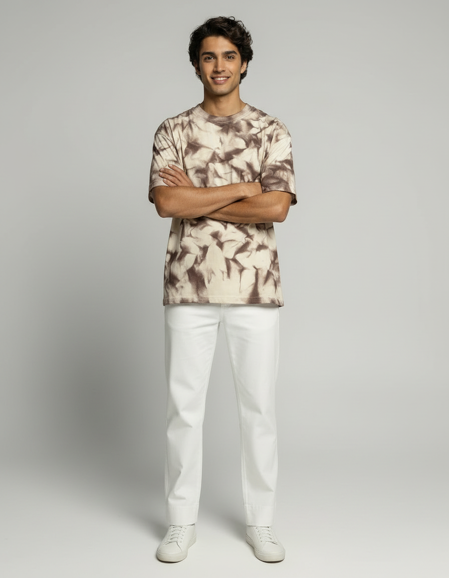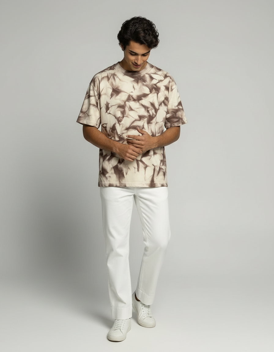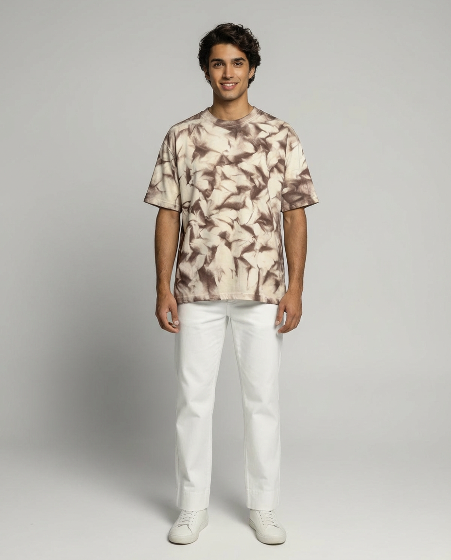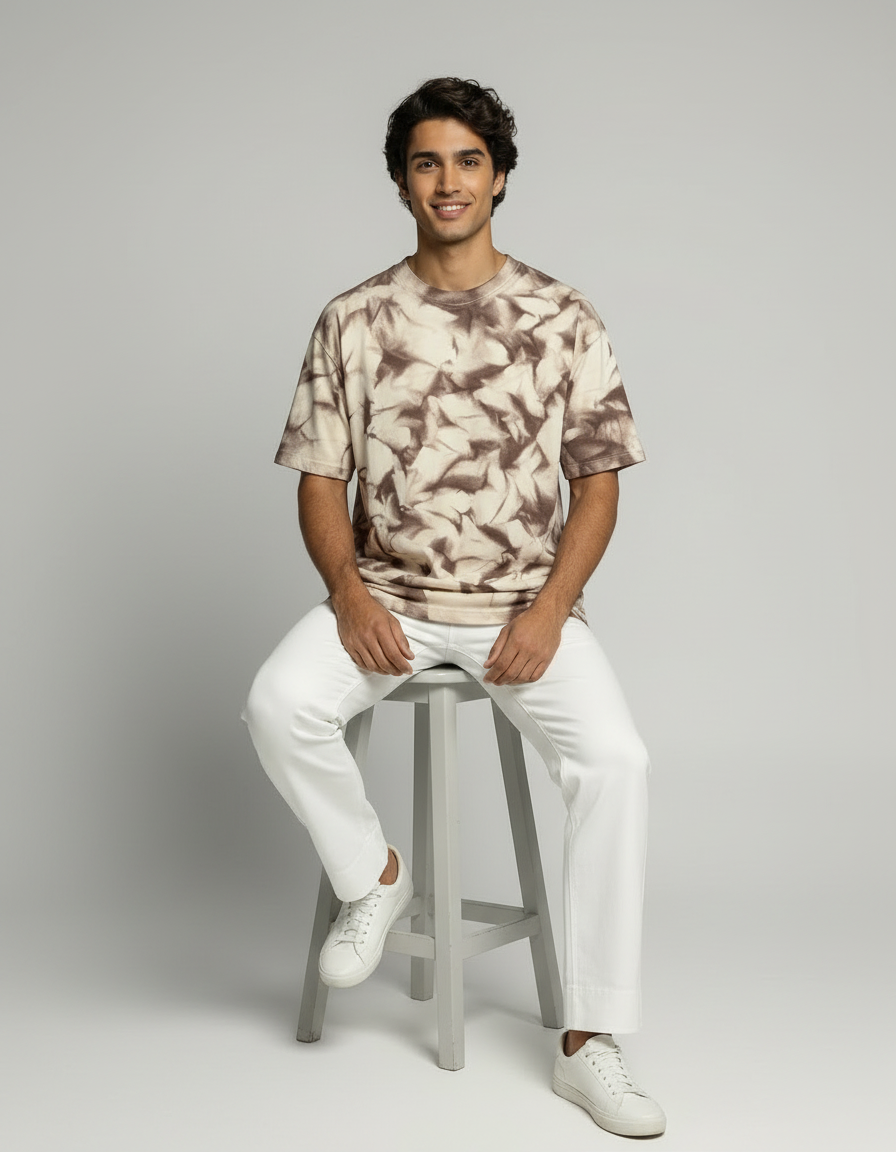 Refresh your streetwear rotation with this Crinkle-Dye Oversized T-Shirt in Beige. Featuring an abstract, crinkle-dye pattern in deep brown over a warm beige base, this tee delivers a bold yet neutral aesthetic perfect for everyday wear. Crafted from premium French Terry fabric, it offers exceptional comfort with a breathable loop-back interior and a smooth outer surface.