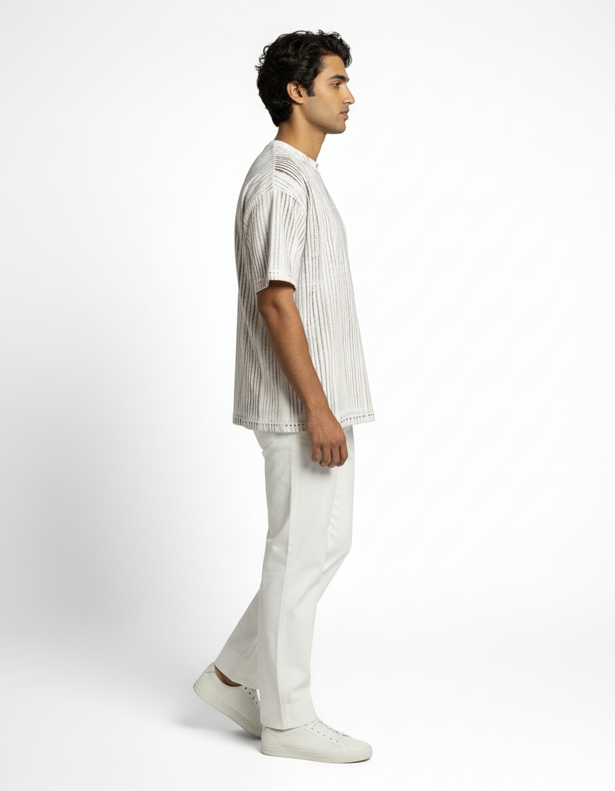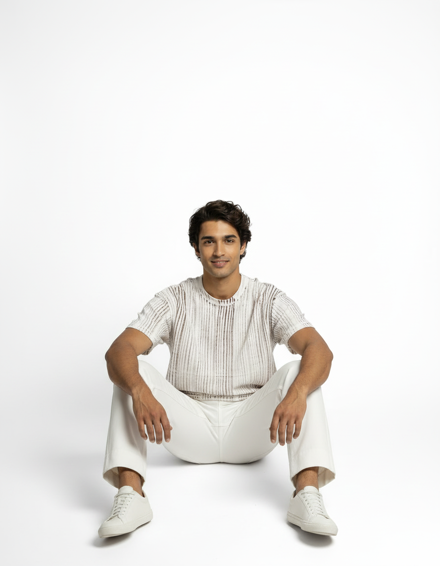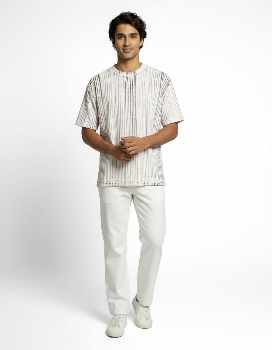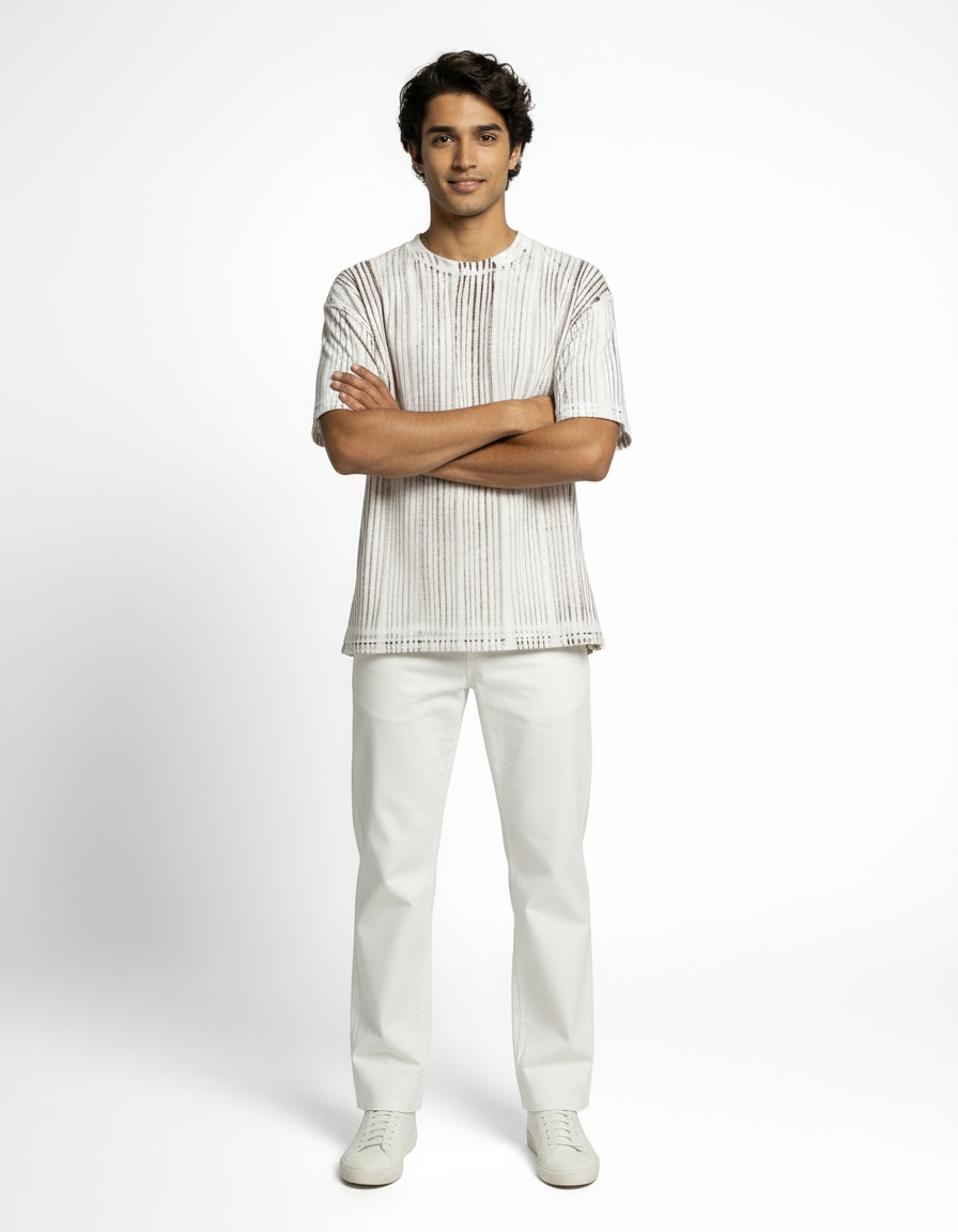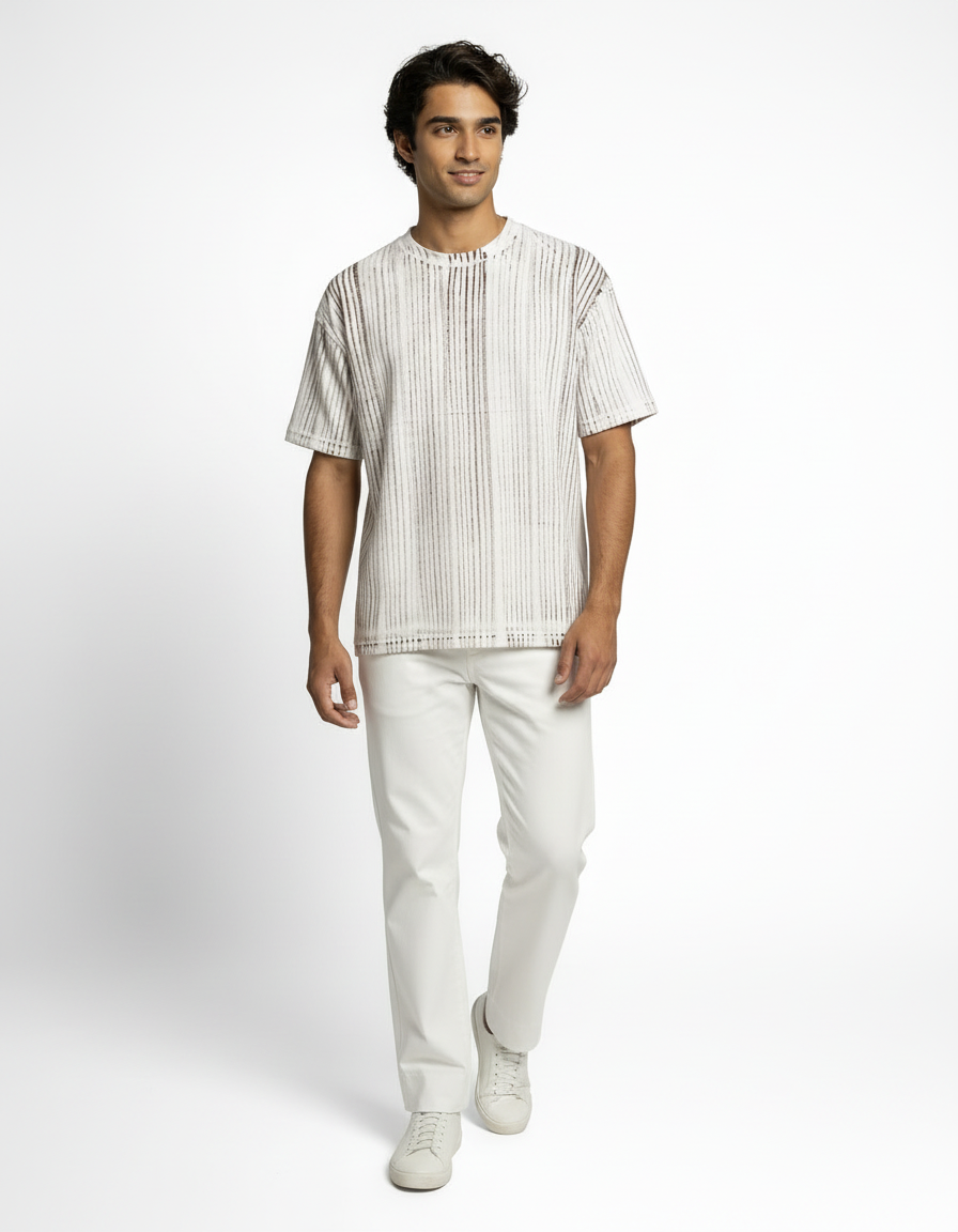Crafted for comfort and character, the Earthline Drift Tee blends artful design with everyday wearability. Made from soft, breathable French Terry fabric, this shirt features a hand-dyed vertical stripe pattern in earthy brown tones over a clean white base. The lightweight texture and relaxed fit make it your go-to piece for laid-back style with a refined twist.