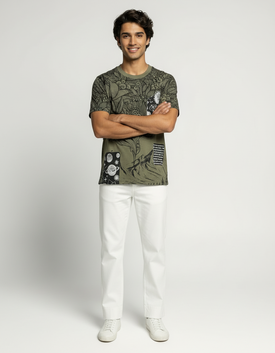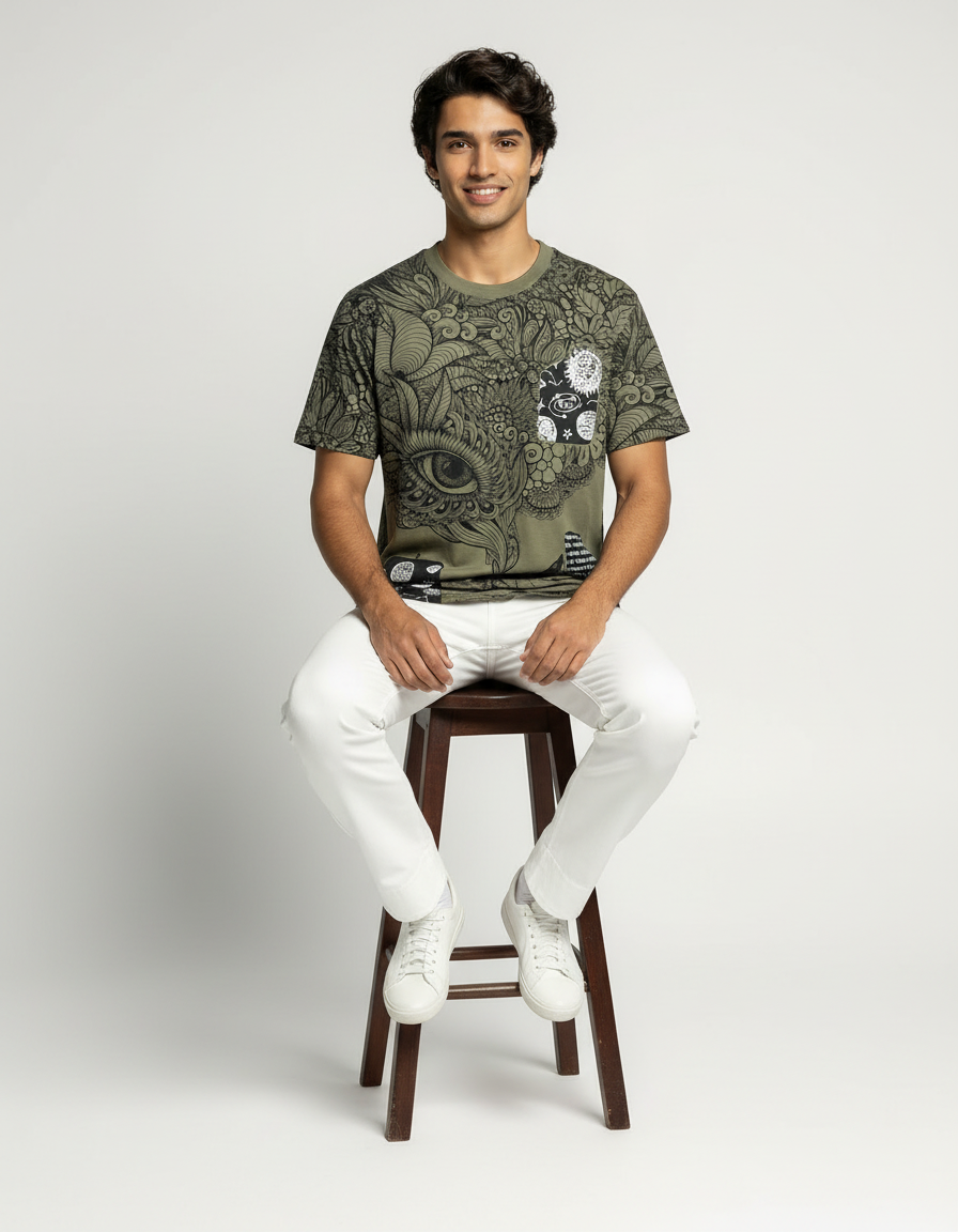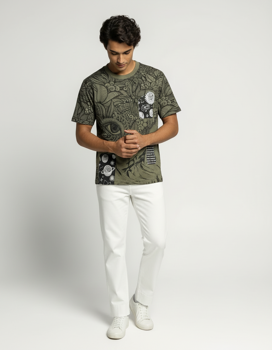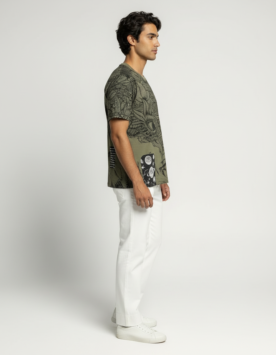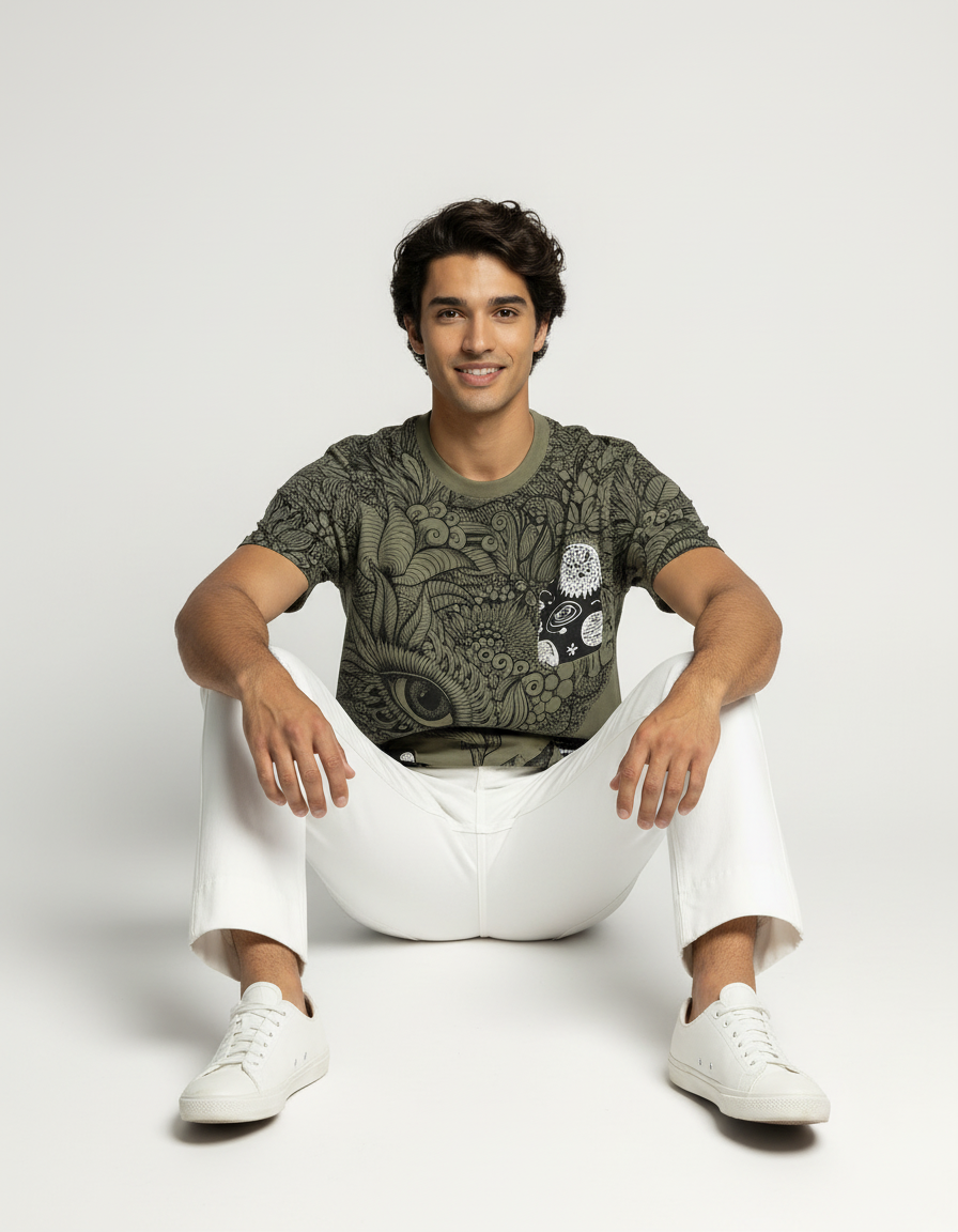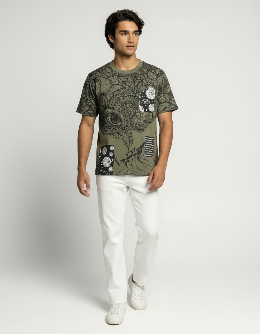 Step into a world of imagination with the Mystic Vision Graphic T-Shirt. Crafted from ultra-soft French terry cotton, this olive-green T-shirt features intricate line-art illustrations that merge nature, mysticism, and surrealism. The detailed eye motif at the center draws attention, while cosmic and botanical elements add layers of depth and intrigue. This isn’t just a tee—it’s wearable art that sparks conversation and individuality.